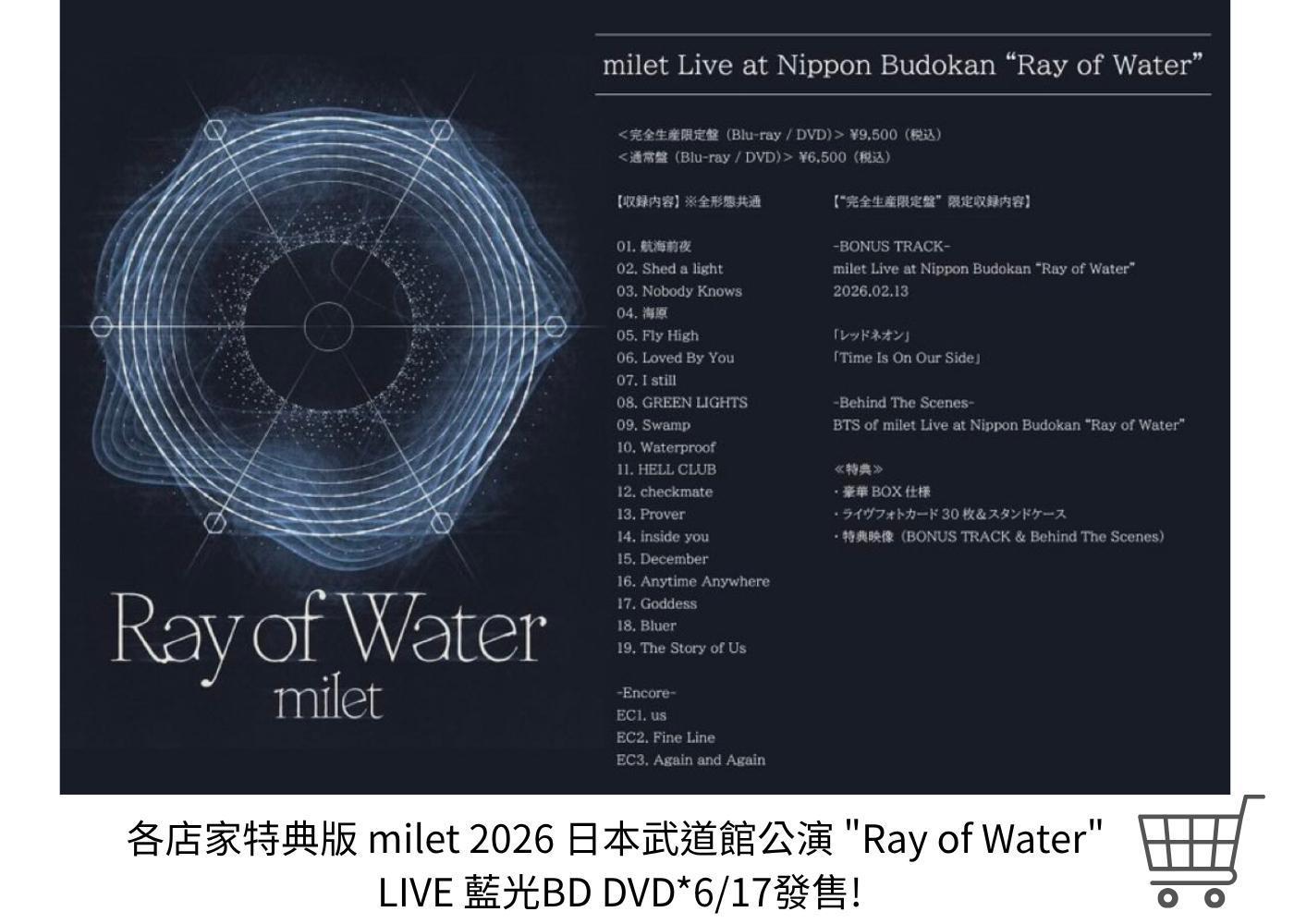 各店家特典版 milet 2026 日本武道館公演 "Ray of Water" LIVE 藍光BD DVD*6/17發售!